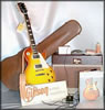 | All 25/50s were made in Gibson's Kalamazoo plant. The regular 8 digit serial number in "YDDDYSSS" format was used on the 25/50 (where "YY" is the year, "DDD" is the day of the year, and "SSS" is the production sequence number, with numbers below 500 used at Kalamazoo). In addition, the 25/50 has a four digit edition number, which presumably gave it that "limited edition" marketing image. The "Made in USA" stamp is also on the back of the headstock. The three 25/50s profiled in this article weigh between 10 lbs. 5 oz. and 10 lbs. 8 oz. According to the 2003 Vintage Guitar Price Guide, Les Paul 25/50 Anniversary Models in excellent condition are selling for $1,700-$2,200.
