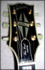 | In any event, the 40th anniversary model isn't remotely similar to its 1952 cousin. The guitar is all black (front and back), with "40th Anniversary" inlayed at the 12th fret. It has an ebony fretboard, P-100 pickups, a gold "Anniversary Limited Edition" logo on the back of the headstock (limited run of 300 were made), regular 8 digit serial number, wide binding in cutaway, gold hardware, and Nashville bridge. The guitar pictured above wins the heavyweight award at a whopping 11 lbs.! | ||