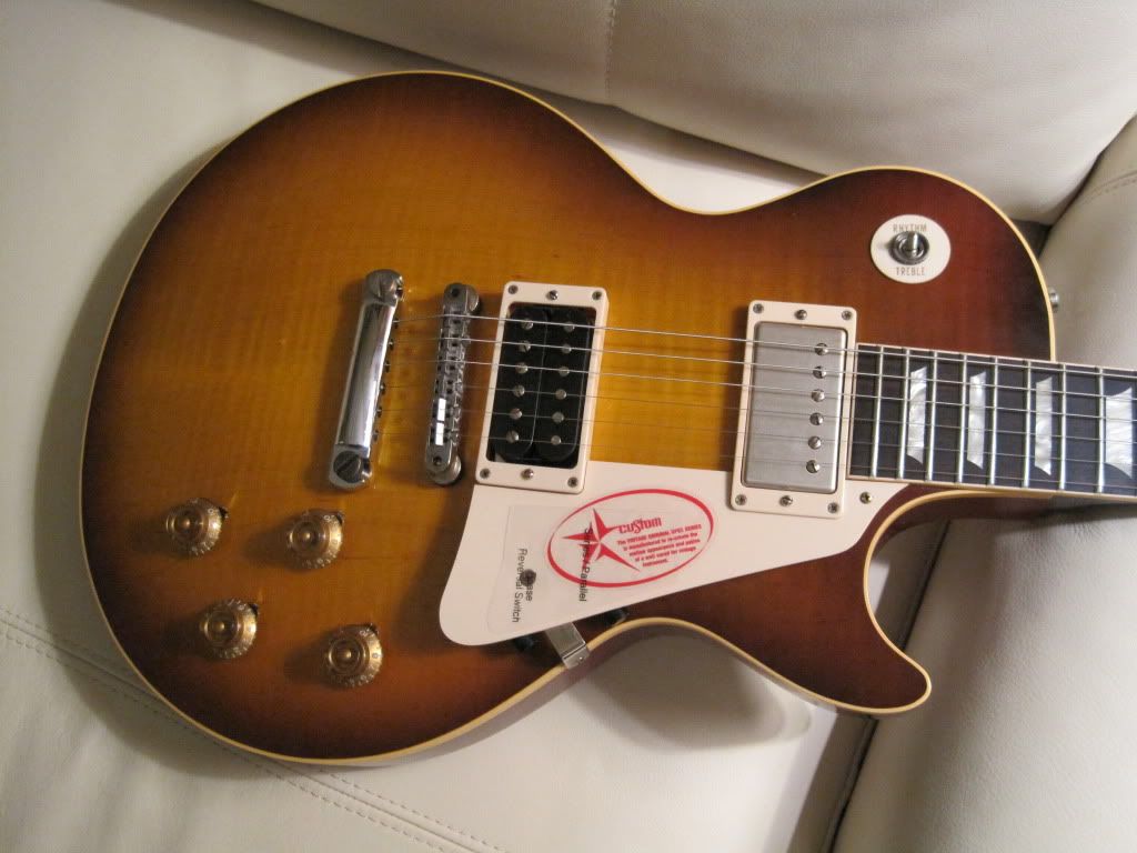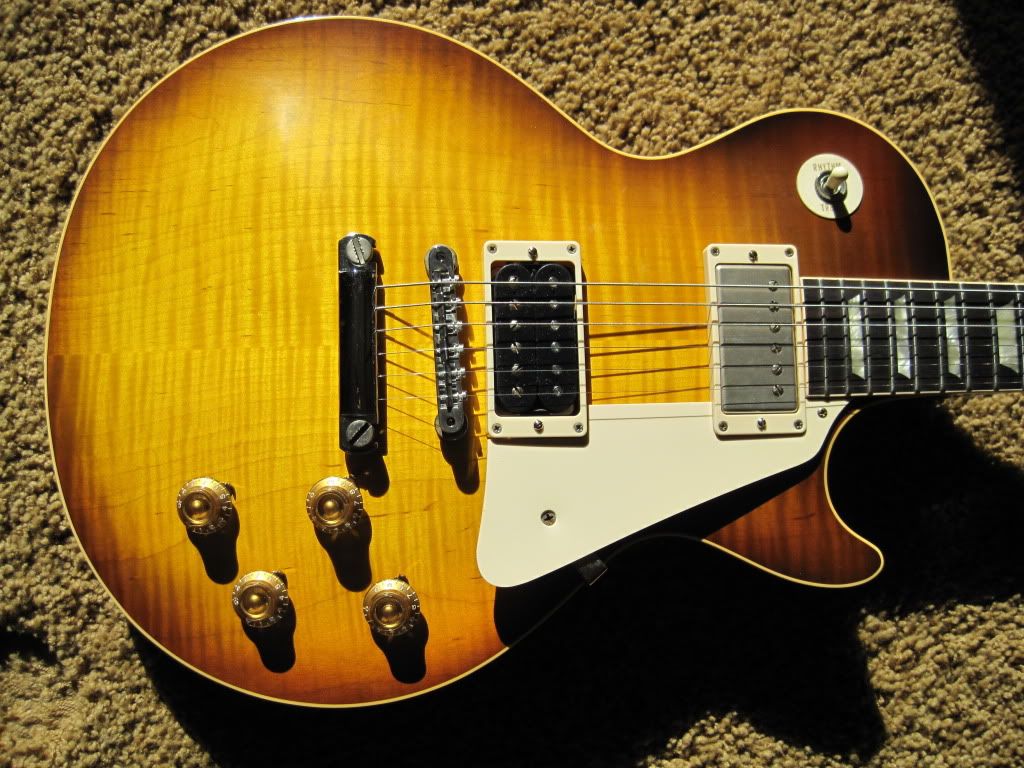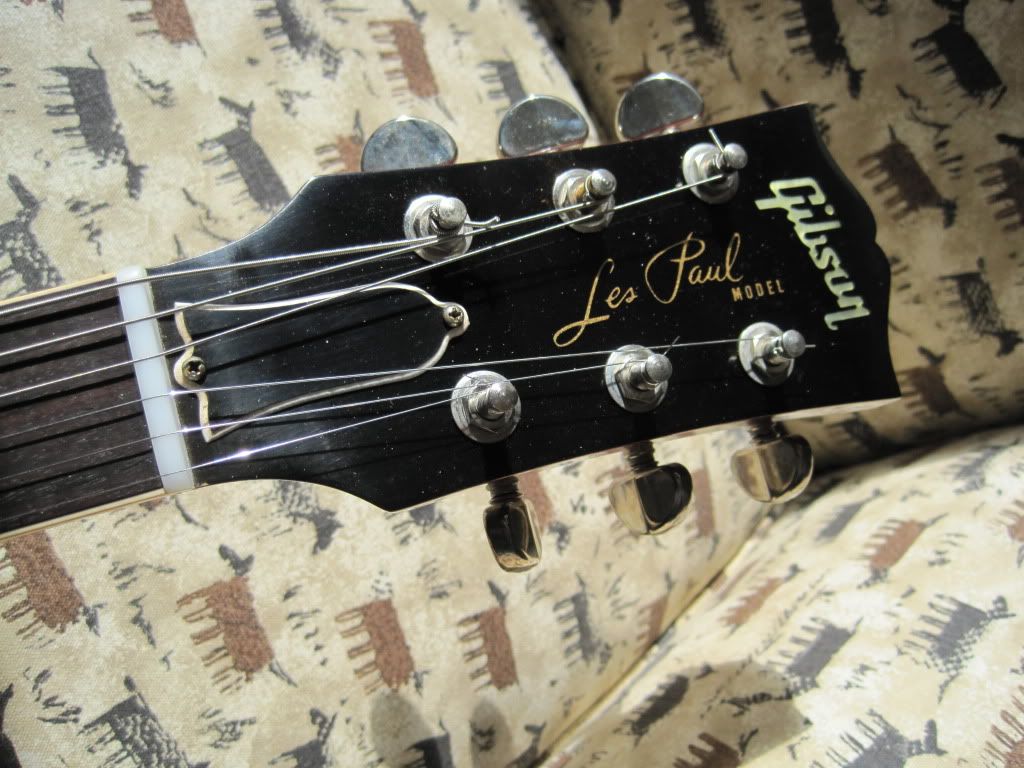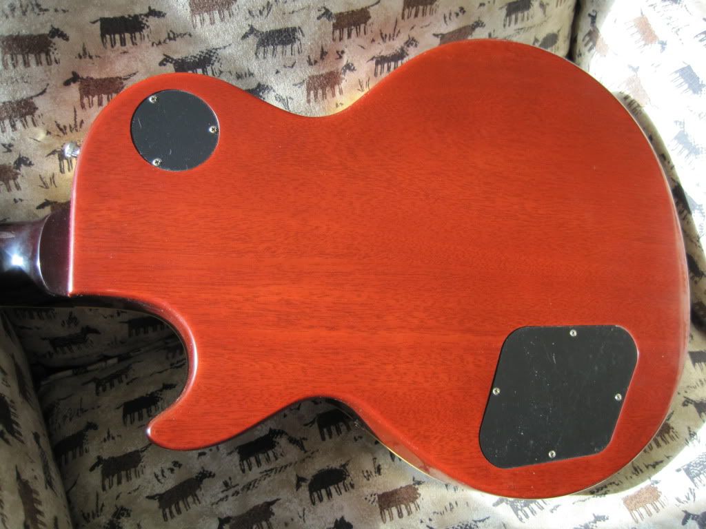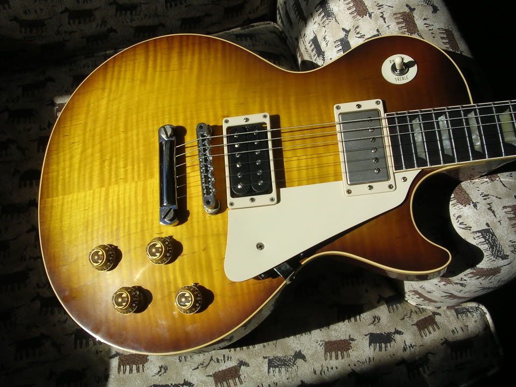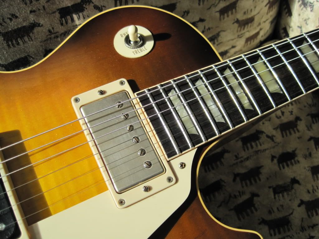 It's late for me tonight but wanted to share a couple of crappy Blackberry shots of my new JP2 VOS. Saul (always a pleasure to work with) helped me with this one. It's a really excellent playing guitar; the lowest action I've ever seen on a historic. The notes ring all across the board including the upper access of the G string. This is my 7th historic LP and so far seems to be the best. The neck looks slim but somehow doesn't feel that way. There is some extra shoulder that seems to make it feel really comfortable. I was really concerned about how the neck was going to be, but after playing it for 3 hours I don't see any issues. I'll get back after I recover from returning to work after a long weekend. I'd be glad to answer any questions as I know there is interest and I'm still trying to learn about these myself.